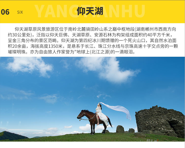 仰天湖南國高山大草原,是湘南地區海拔最高的高山草原,有天平天國烽火臺舊址、高山梯田、高山云海等自然和歷史景觀是戶外、攝影創作勝地。
