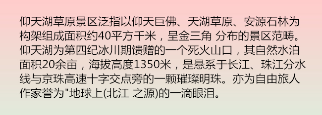 DAY1::郴州市區接團一仰天湖景區一入住東江麗景酒店12點左右郴州市區(具體時間地點以出發前一天工作人員通知為準!)接貴客前往【仰天湖景區】,車程約1個半小時,大約有1小時盤山公路,暈車的小伙伴提前準備好暈車藥哦!景區游完時間2小時。景區內有【動漫風車】高聳入云的“大風車”沿著山脊蜿蜒數百公里,高聳入云猶如一條條巨龍騰空遠去,蔚為壯觀。【網紅餐車】在草原上走累了有馬卡龍配色的網紅餐車作為您的能量補給站不同顏色的餐車讓你分分鐘拍出網紅大片。晚上入住東江麗景酒店