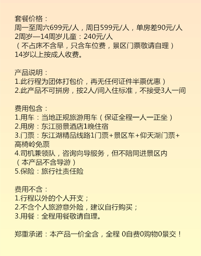 第二天:東江湖景區一霧漫小東江一高椅嶺--郴州送團早起酒店出發前往東江湖售票廳換乘景區車到霧漫小東江6:30-9:30,景區有安排漁夫撒網表演哦。觀后沿小東江觀霧棧道往上游走到3號或者4號站臺,繼續乘坐景區環保車前往終點站--東江大壩旅游碼頭。抵達大壩后可前往【龍景峽谷瀑布群】(參考時間約1.5小時龍景峽谷全線游程2.5公里。看山景,山勢陡峭,青山滴翠,古木參天;觀水景,一條清澈的溪流在峽谷中穿行,瀑布成群沿途可以觀賞到煙竹山瀑布、龍景瀑、龍吟瀑、三疊瀑、龍卷瀑、鴛鴦瀑等形態各異的瀑布和古松坳、連理樹、龍鱗石等干姿百態的景點。