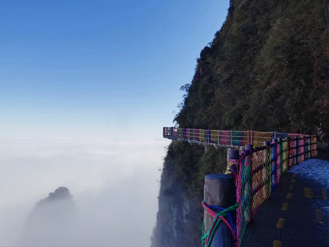 五指峰景區是由中景信集團的歷數三年巨資投入、超前規劃、人性設計、精工建設及匠心打造,南中國最長懸空棧道:總長約8公里,海拔1400米1600米兩層棧道,全程無障礙觀光環線,登高山、臨絕壁如履平地。