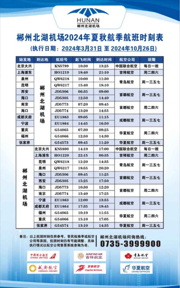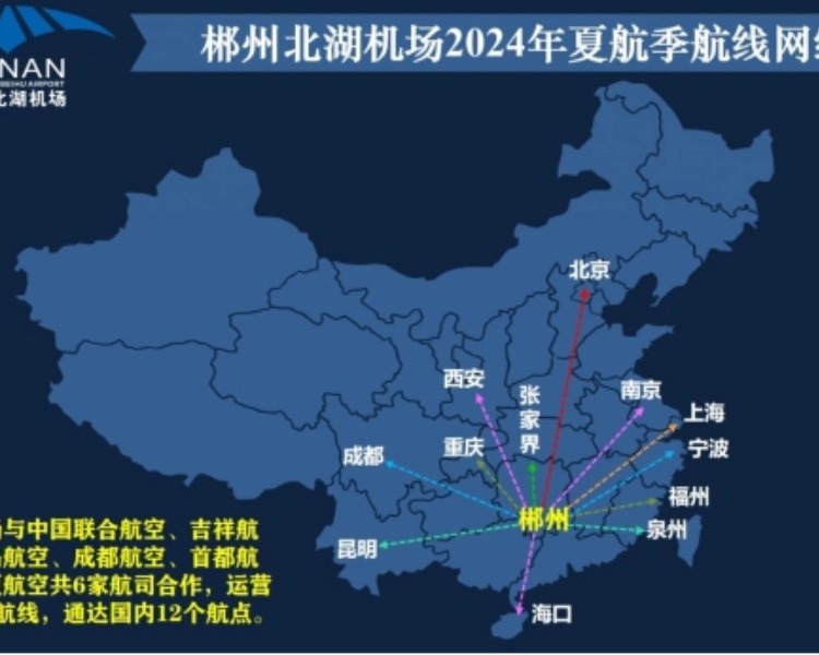 自2024年3月31日(星期日)起,至10月26日止。中國民航開始執行夏航季航班計劃。本次航班換季郴州北湖機場恢復了張家界航點。新航季與6家航空公司,合作運營8條往返航線,通達國內北京大興、上海浦東、成都天府、重慶、西安、海口、南京、福州、昆明、泉州、寧波、張家界共12個航點。