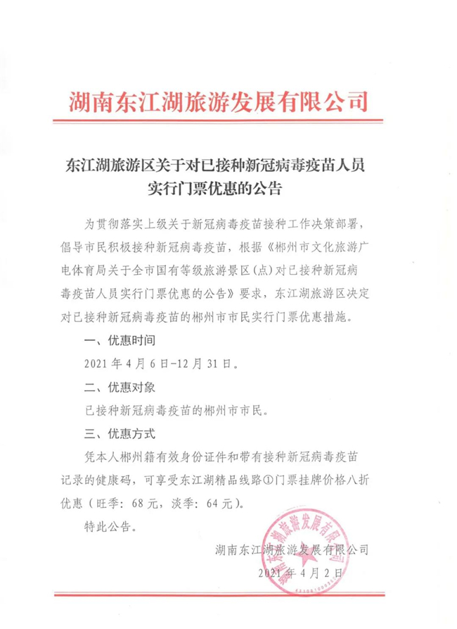 2021年4月6日-12月31日。 二、優惠對象 已接種新冠病毒疫苗的郴州市市民。 三、優惠方式 憑本人郴州籍有效身份證件和帶有接種新冠病毒疫苗記錄的健康碼,可享受東江湖精品線路①門票掛牌價格八折優惠(旺季:68元,淡季:64元)。