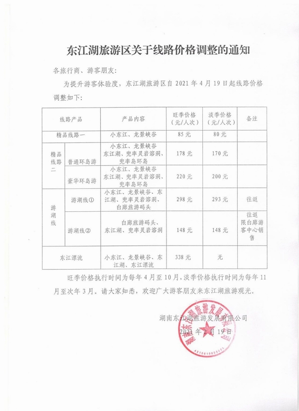 2021年?yáng)|江湖景區(qū)新價(jià)格出來(lái)了,東江湖旅游區(qū)關(guān)于線路價(jià)格調(diào)整的通知如下: