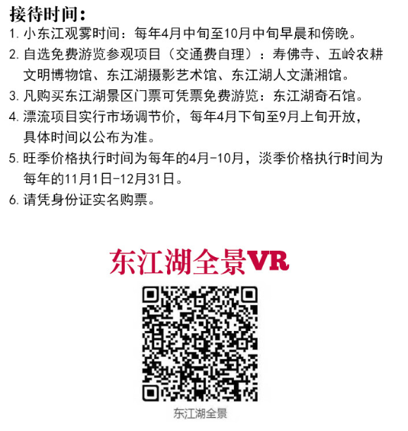入園方式:憑訂單短信驗證碼或身份證至東江門樓售票中心(東江湖風景旅游區入口處)網絡取票處換取門票入園,取票時需出示本人身份證