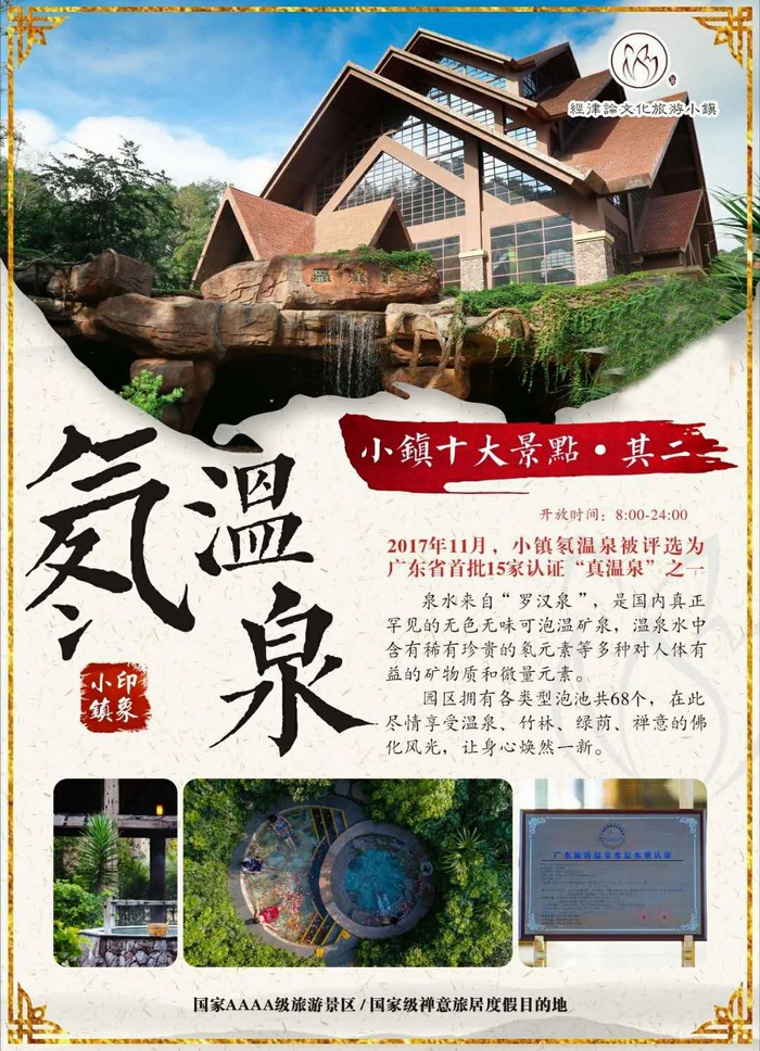 園區內集禪修、溫泉、度假、養生于一體,是禪意旅居度假目的地。小鎮先后順利通過國家AAAA級旅游景區、廣東省文體休閑旅游服務先進標準體系試點驗收。